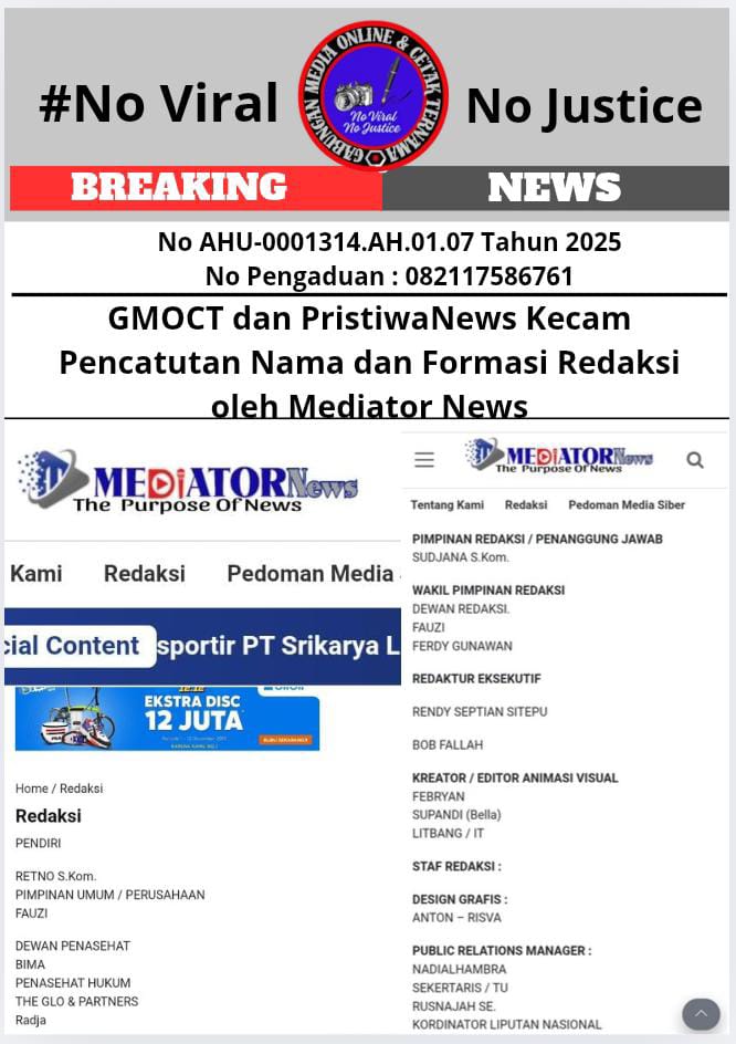 Lintangpena.com Jakarta (GMOCT) – Pimpinan Perusahaan Pristiwa News (Pristiwa TV Channel), Umar Fauzi, melontarkan kecaman keras terhadap media online Mediator News atas tindakan pencatutan nama dan formasi susunan redaksi yang persis sama dengan milik PristiwaNews. Kejadian ini terungkap pada Rabu (28/05/2025), setelah seorang rekan wartawan memberikan informasi mengenai kesamaan susunan redaksi kedua media tersebut.